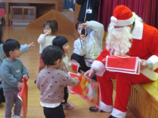 サンタさんを間近で見た子どもたちは「うわー、サンタさんだ!」「何のプレゼントだろう?」とワクワクしていました。